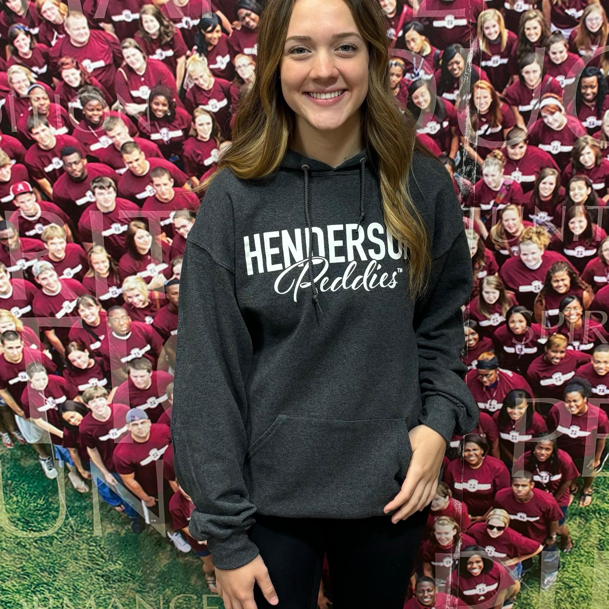 Basic Henderson Reddies hoodie with script letters overlay block letters across the chest. 50% Cotton 50% Polyester