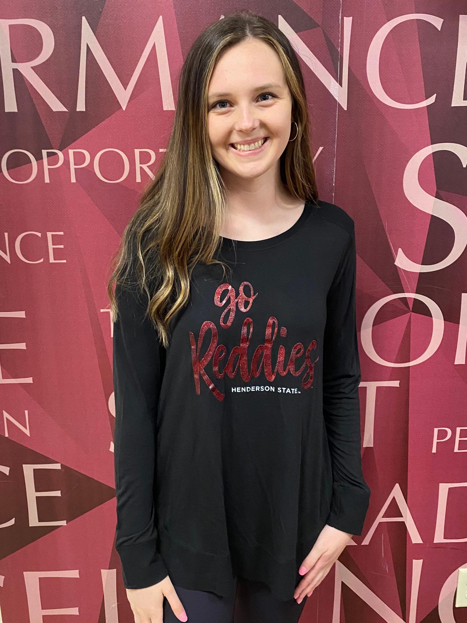 Are you a Reddies fan that loves to show off your pride? Introducing the Go Reddies Henderson State long sleeve shirt! This long sleeve is super comfortable and has that sparkle that every girl looks for! Stand out and shine on that field cheering on those Reddies! Originally $32.99