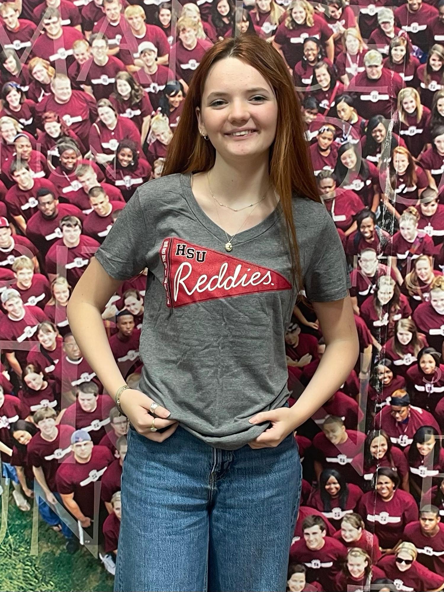 HSU Reddies pennant design on a soft SS v-neck tee. 50% Polyester 25% Cotton 25% Rayon
