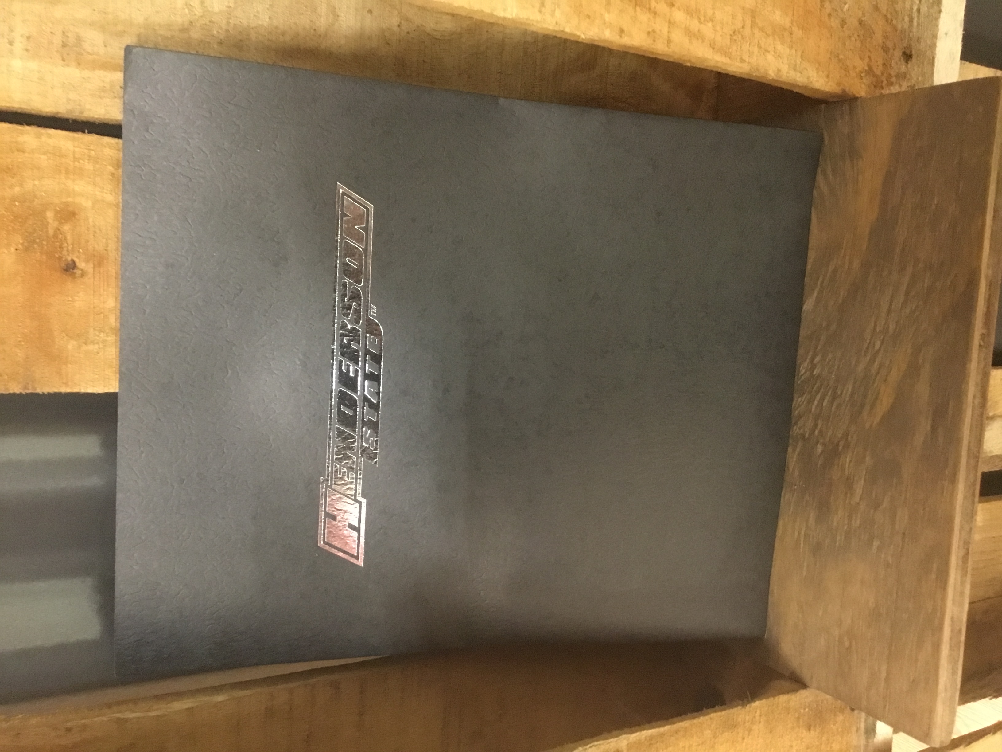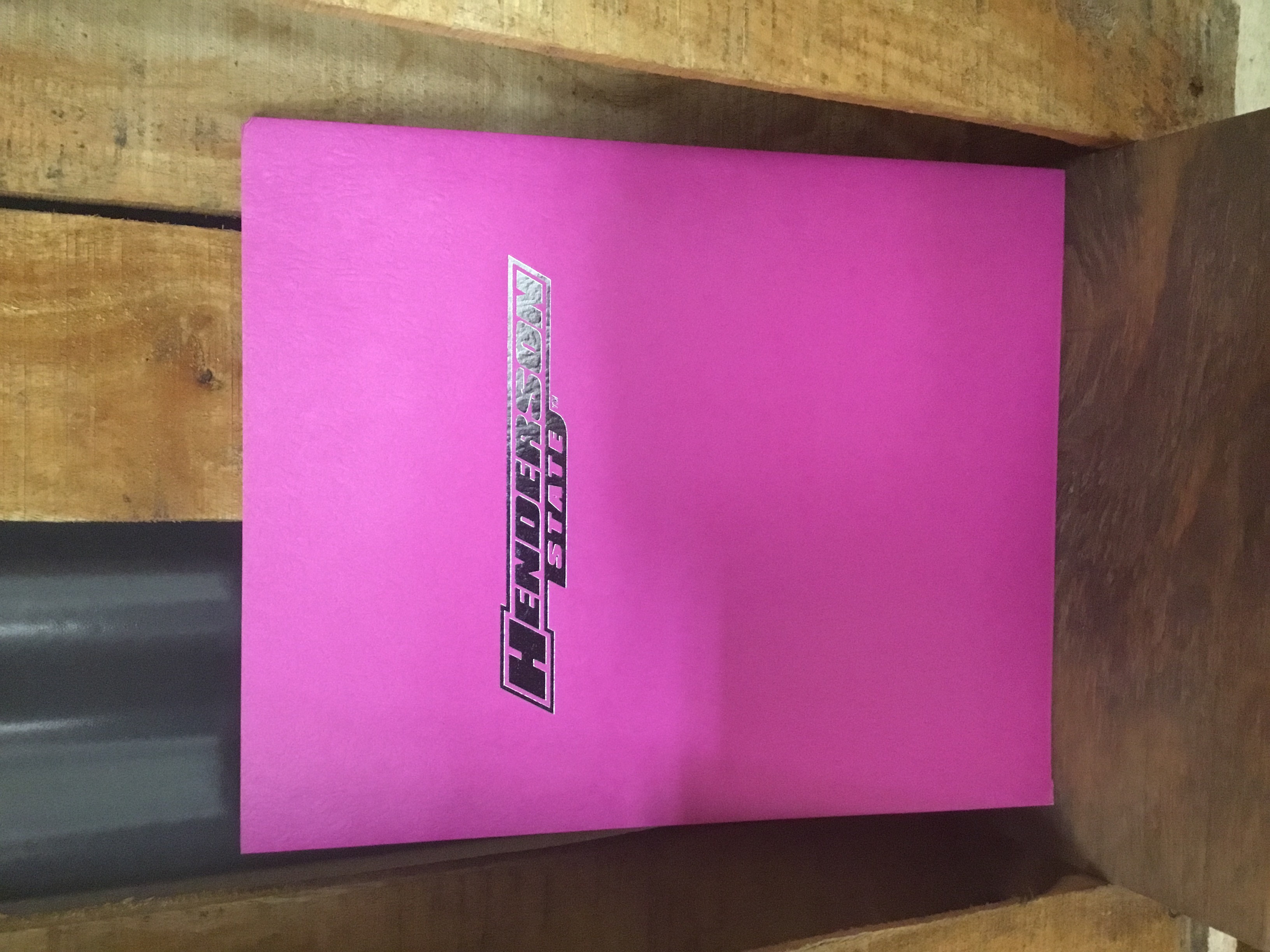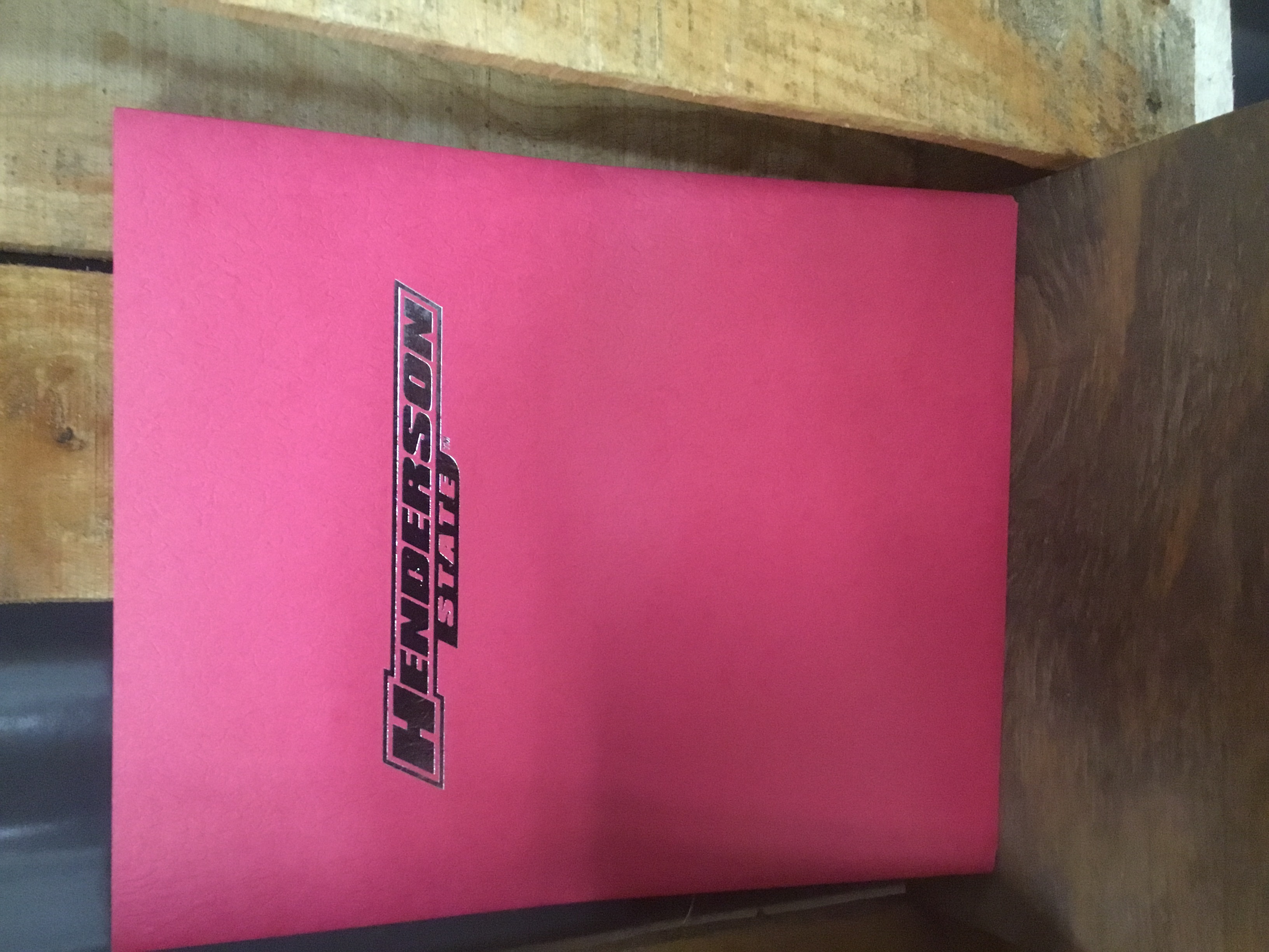 Red, gray, pink and Black Henderson State paper pocket folders.