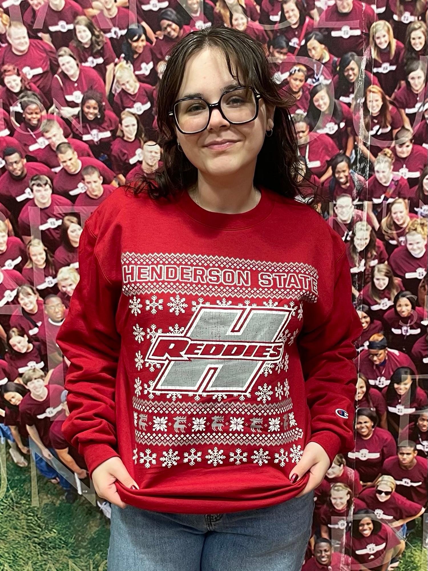 HSU Reddies apparel, Christmas fleece crew, college spirit sweatshirt, Henderson State University gear. 50% Cotton 50% Polyester