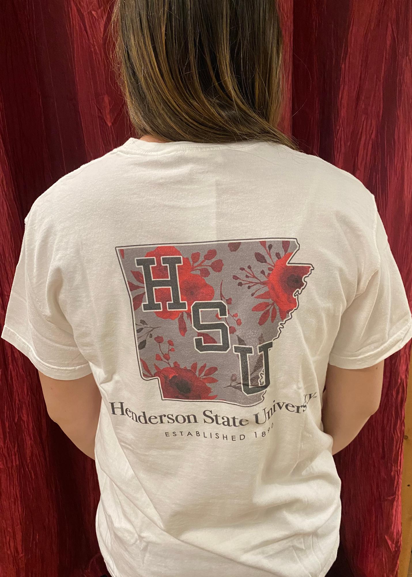 As a die-hard HSU fan, you love to illustrate your unwavering devotion no matter where you go. You'll be able to accomplish that goal perfectly when you put on this white HSU short sleeve tee featuring our state of Arkansas filled with a beautiful floral design.