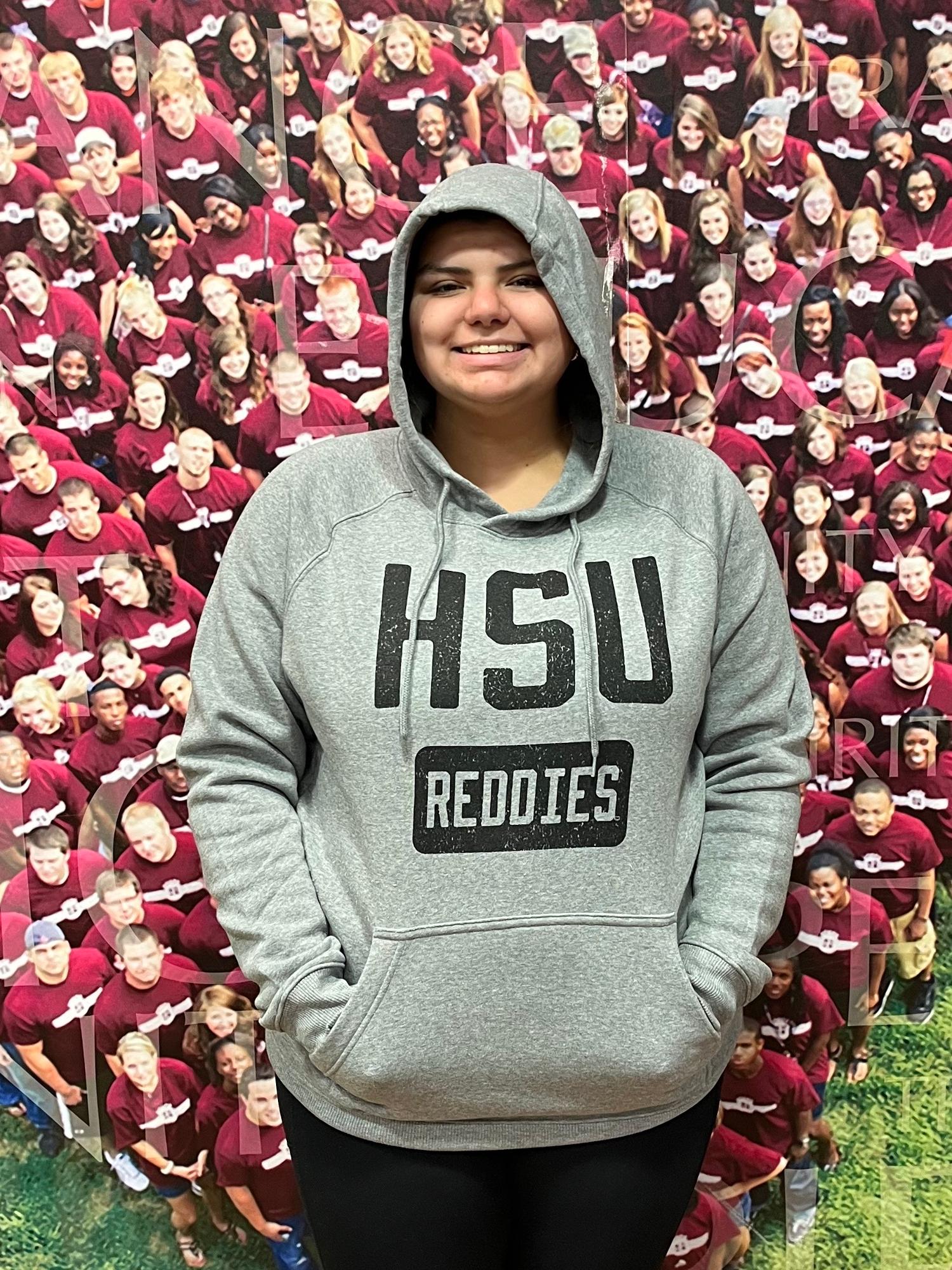 HSU Reddies hoodie, Champion fleece, Henderson State apparel, college spirit wear. 47% Cotton 39% Polyester 14% Rayon