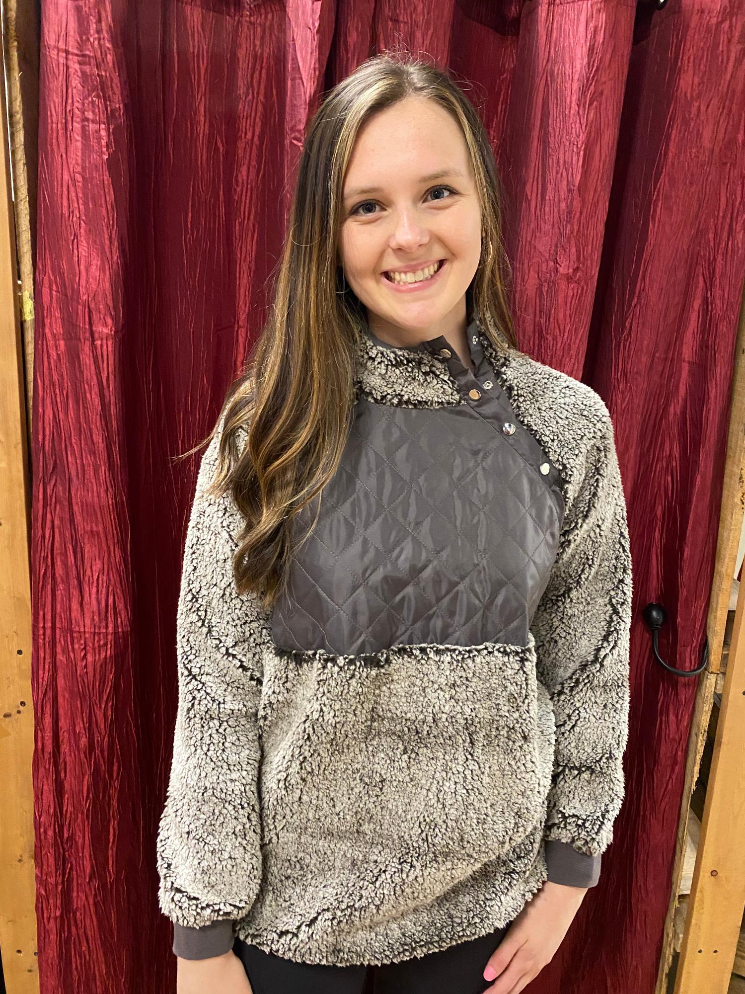 Stay warm and display your Reddie pride with this Reddies Heathered Cross-Front Snap Sherpa! The cross-front snap adds a different design than your normal Sherpa.